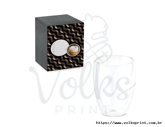 Copo em vidro borossilicato com parede dupla, isolada a ar. Capacidade até 350 mL. Fornecido em caixa presente personalizável. Certificação EU Food Grade. ø87 x 113 mm | Caixa: 95 x 95 x 125 mm