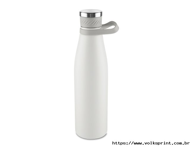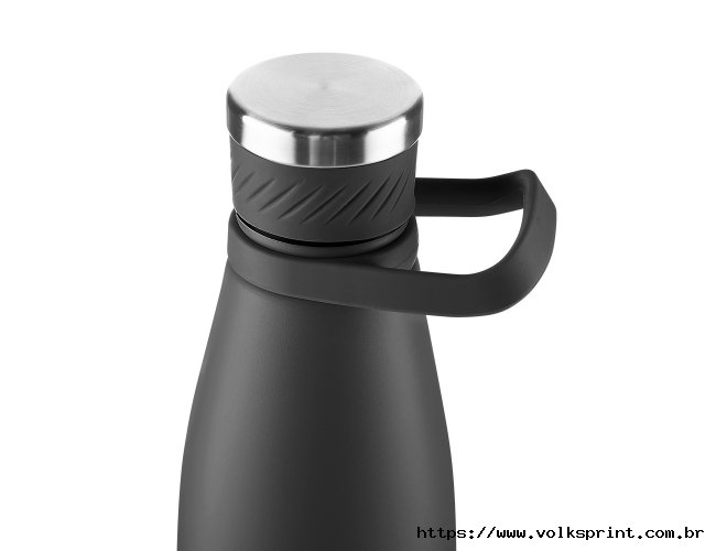 Garrafa térmica de 750 ml com parede dupla em inox (interno 304 / externo 201), acabamento com pintura a pó e tampa em inox 201 com anel de silicone para vedação, possui alça em silicone para transporte.