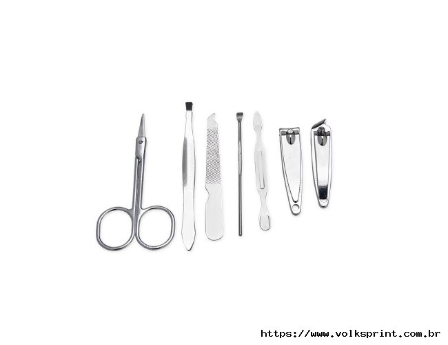 Kit manicure 7 peças em estojo de couro sintético. Contém: tesoura, 2 cortadores de unha, pinça, lixa, empurrador de cutícula e espátula para ouvido.