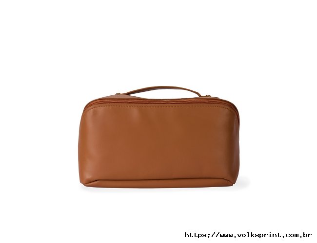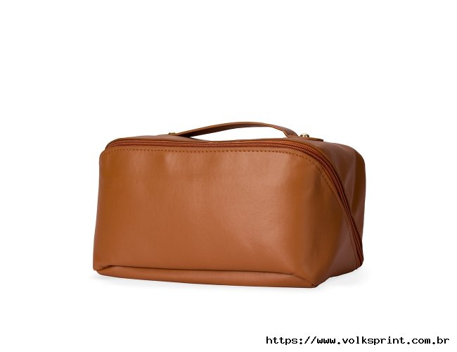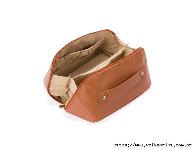 Nécessaire confeccionado em poliuretano (PU) impermeável com abertura em 180 graus que remete ao formato de uma concha. Possui amplo compartimento interno com dois bolsos laterais abertos e um central com fechamento em zíper. Contém uma alça para transporte.